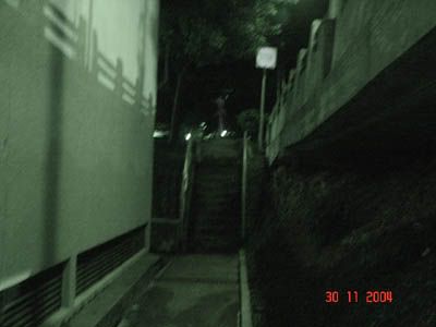 taken with the night shot function, and taken at a flight of stairs. look carefully at the top of the stairs. do you see a white misty figure????